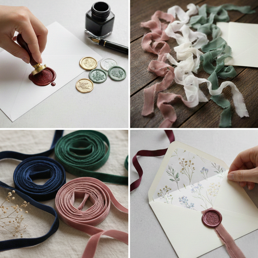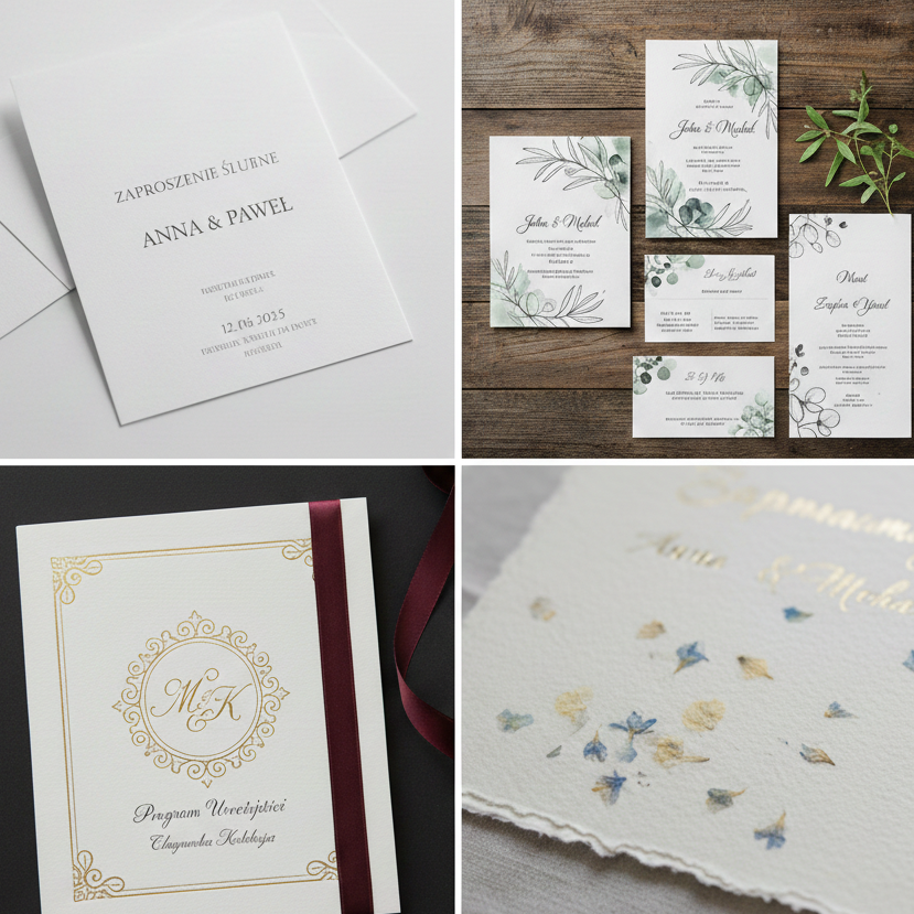 Koperty: Wysokiej jakości koperty o podwyższonej gramaturze, pasujące do stylu zaproszeń.